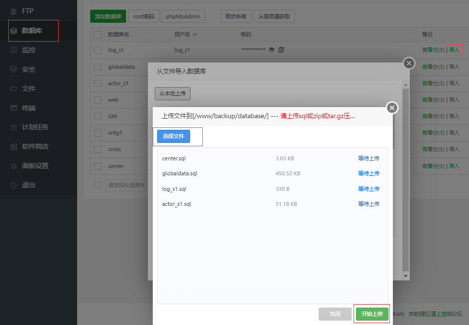 宝塔设置数据库root密码为123456,并创建以下数据库: