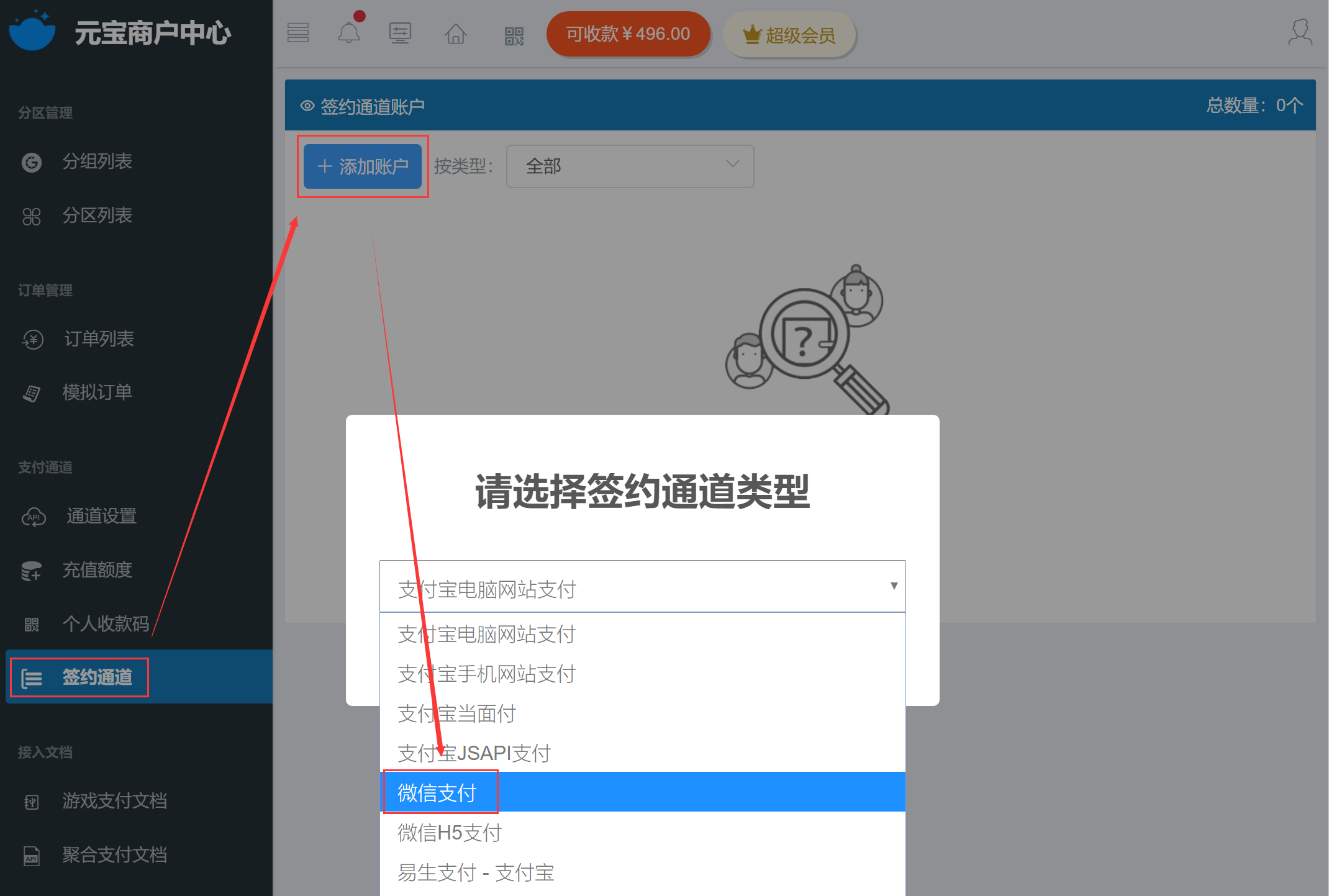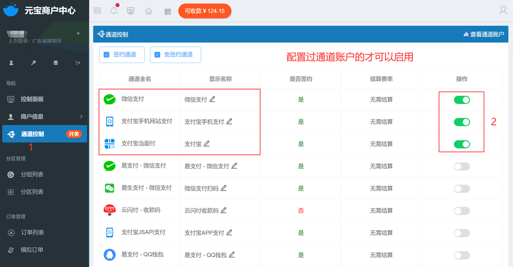 商户中心 → 通道控制,启用已经绑定账户的支付通道即可;