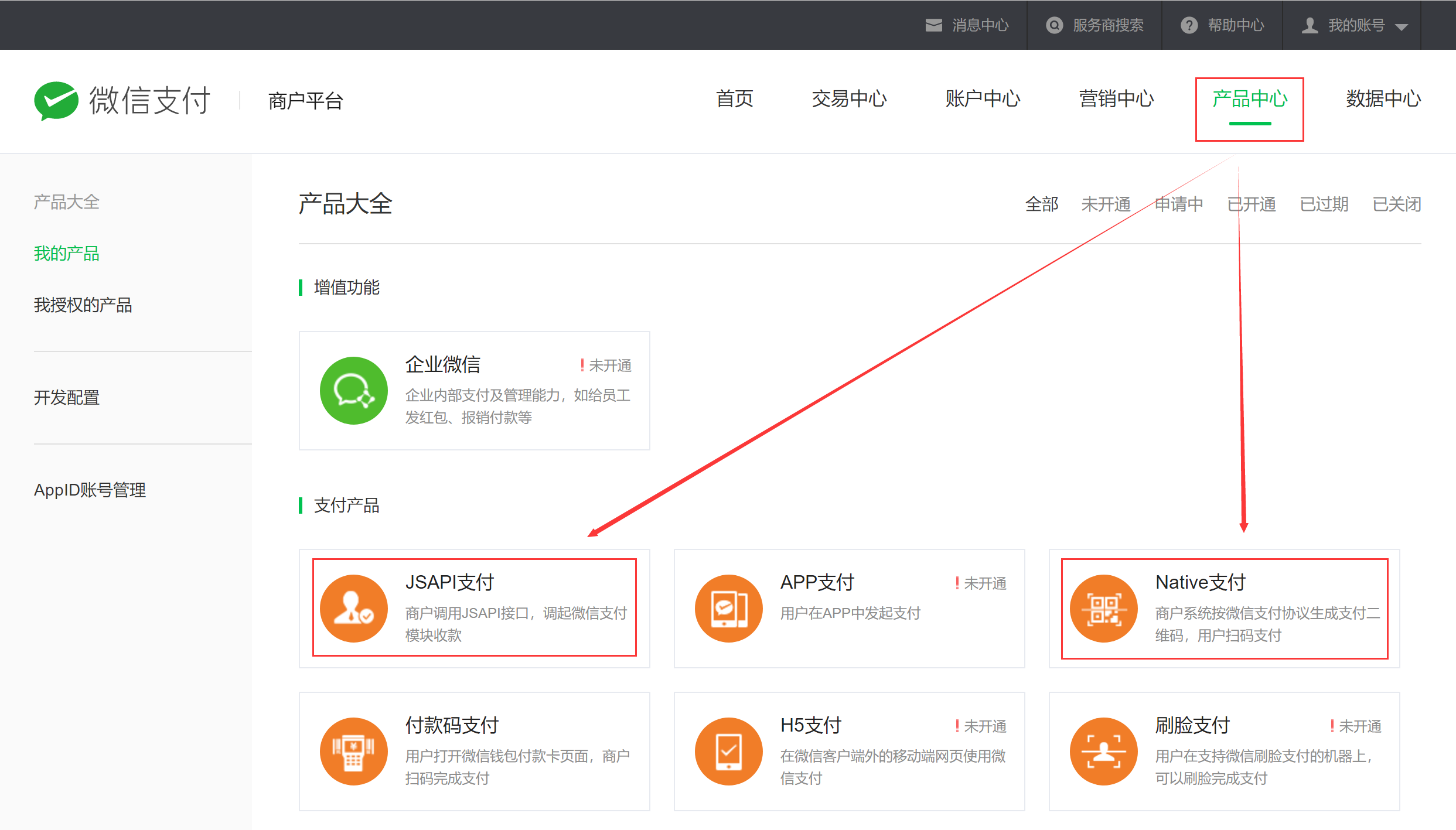 2、登录微信支付商户平台,产品中心开通Native支付和JSAPI支付