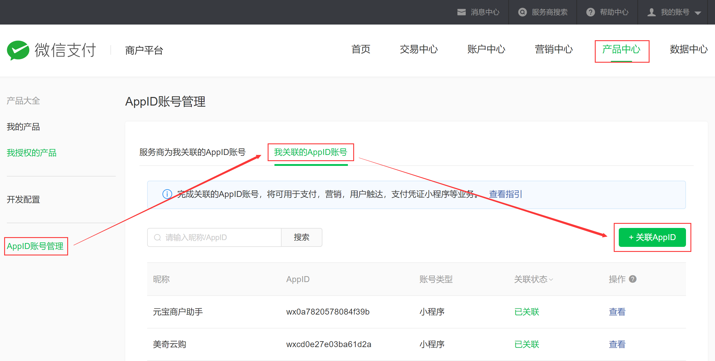 3、微信支付商户平台 → 产品中心 → AppID账号管理,点击“+关联AppID”,填写小程序的AppID,向小程序正式发起授权邀请;
