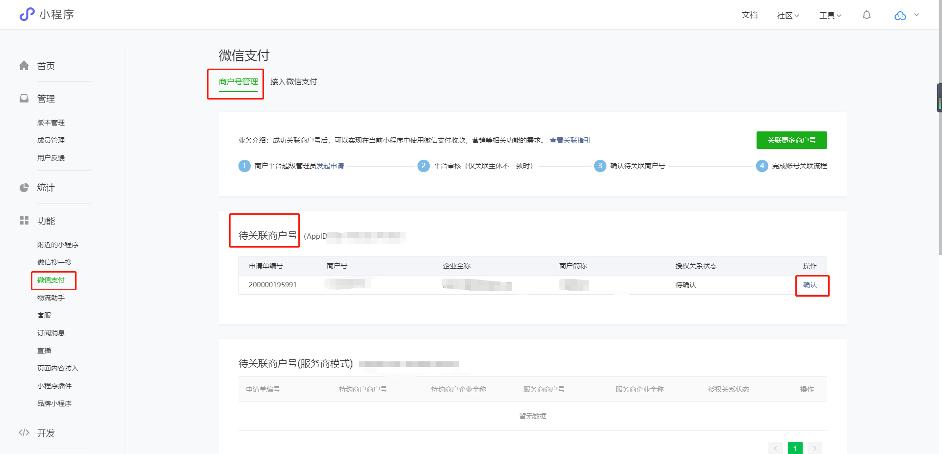 4、返回微信公众平台,左侧菜单找到“微信支付” → 商户号管理,在待关联商户号里点击“确认”,同意授权即可。