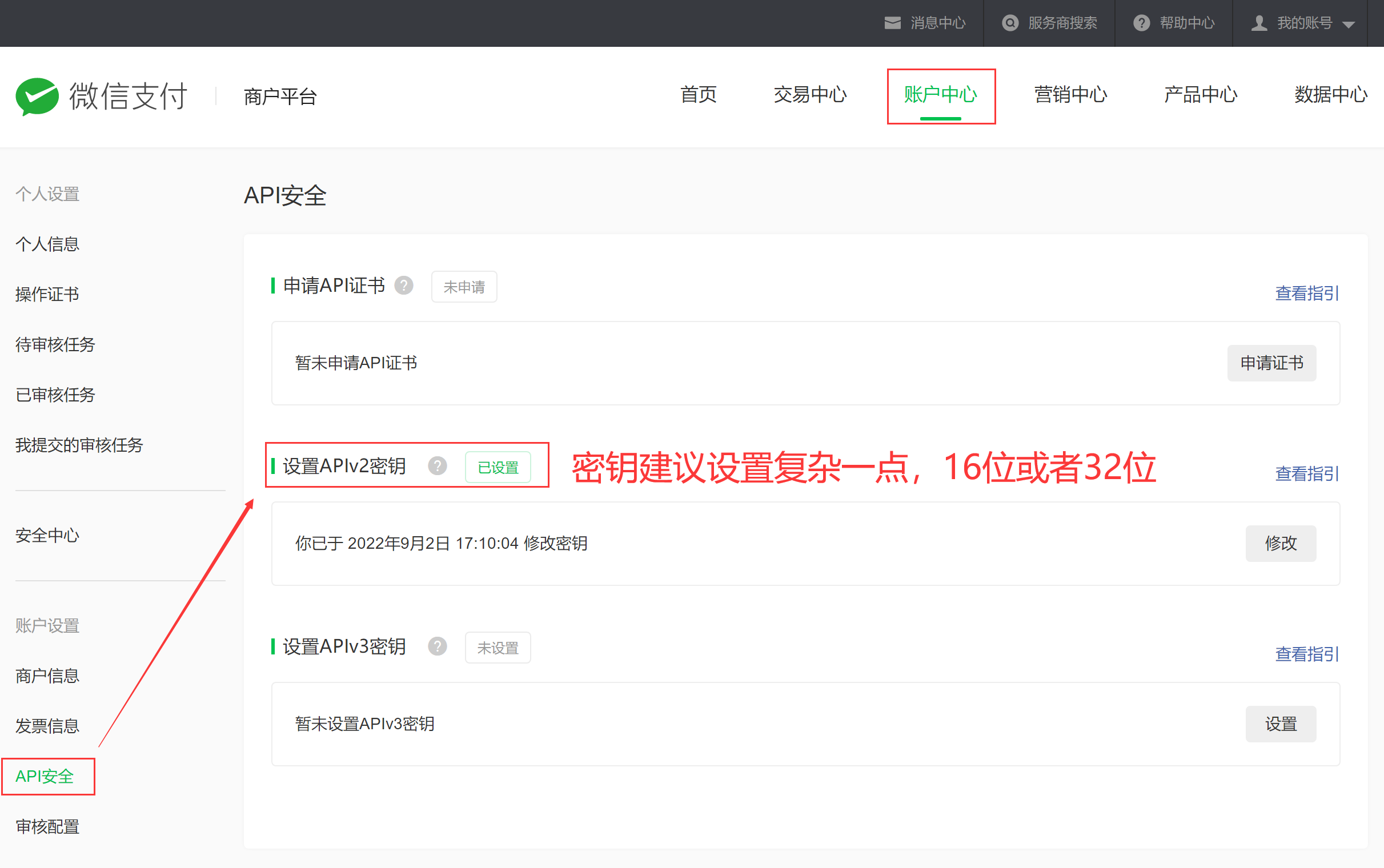 5、微信支付商户平台 → 账户中心 → API安全 → 设置APIv2密钥,这个就是支付密钥 (APIv2密钥建议使用小写英文字母,不要包含中文和大写英文字母)